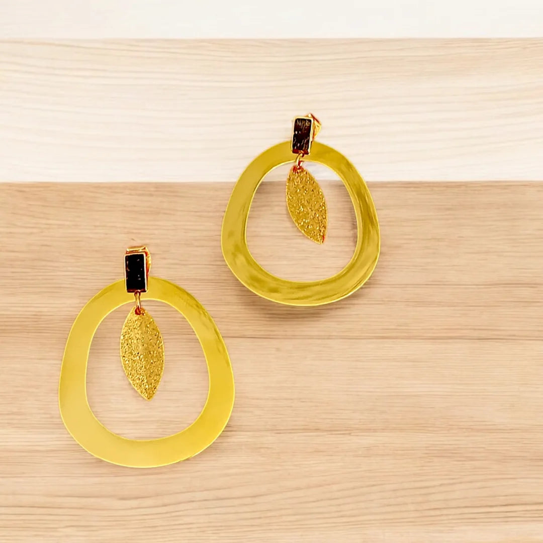 Ces boucles délicates associent formes géométriques et inspiration naturelle. La feuille centrale texturée semble flotter dans son écrin ovale, pour une silhouette à la fois graphique et poétique.