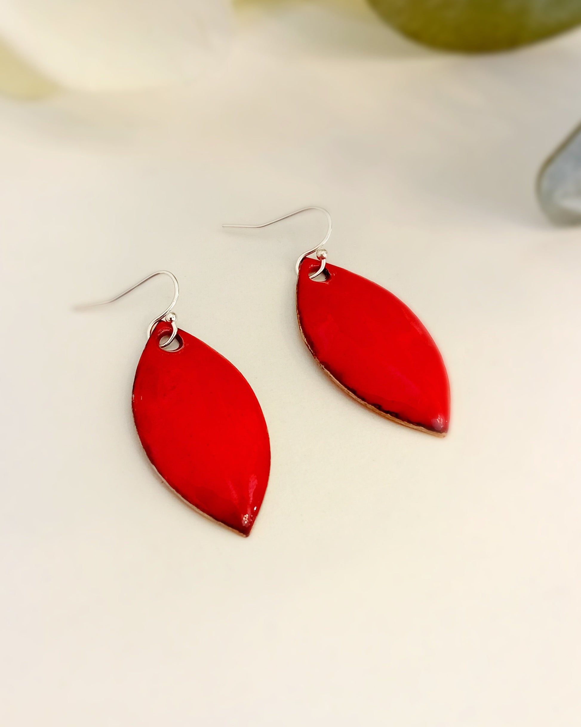 Boucles d’oreilles feuilles rouges – Émaux d’art sur métal