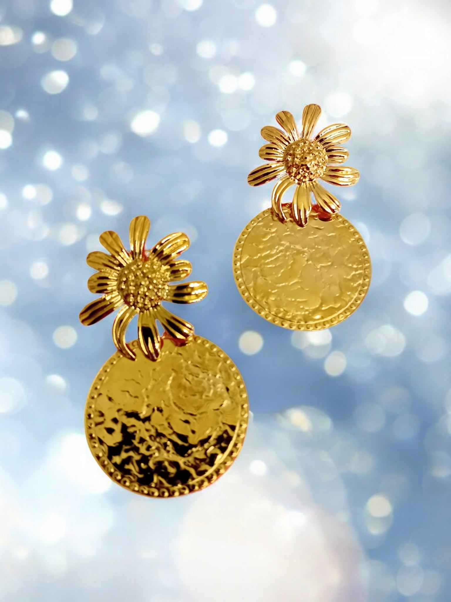 Ces boucles solaires marient une marguerite stylisée et un disque martelé pour une allure à la fois joyeuse, éclatante et ultra féminine. Parfaites pour faire entrer un peu d’été dans votre quotidien ! 🌼