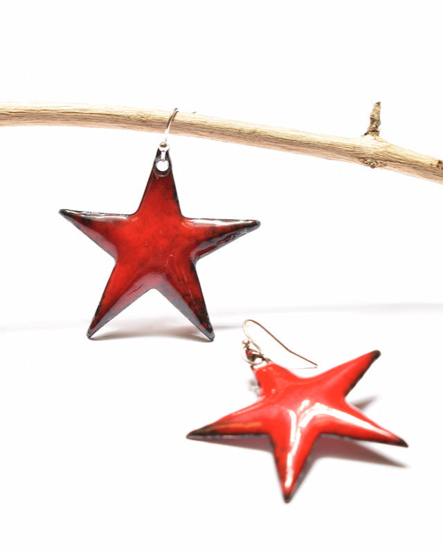 Boucles d’oreilles Grandes Étoiles Rouges en Émail – Bijou Fait Main en Argent 925