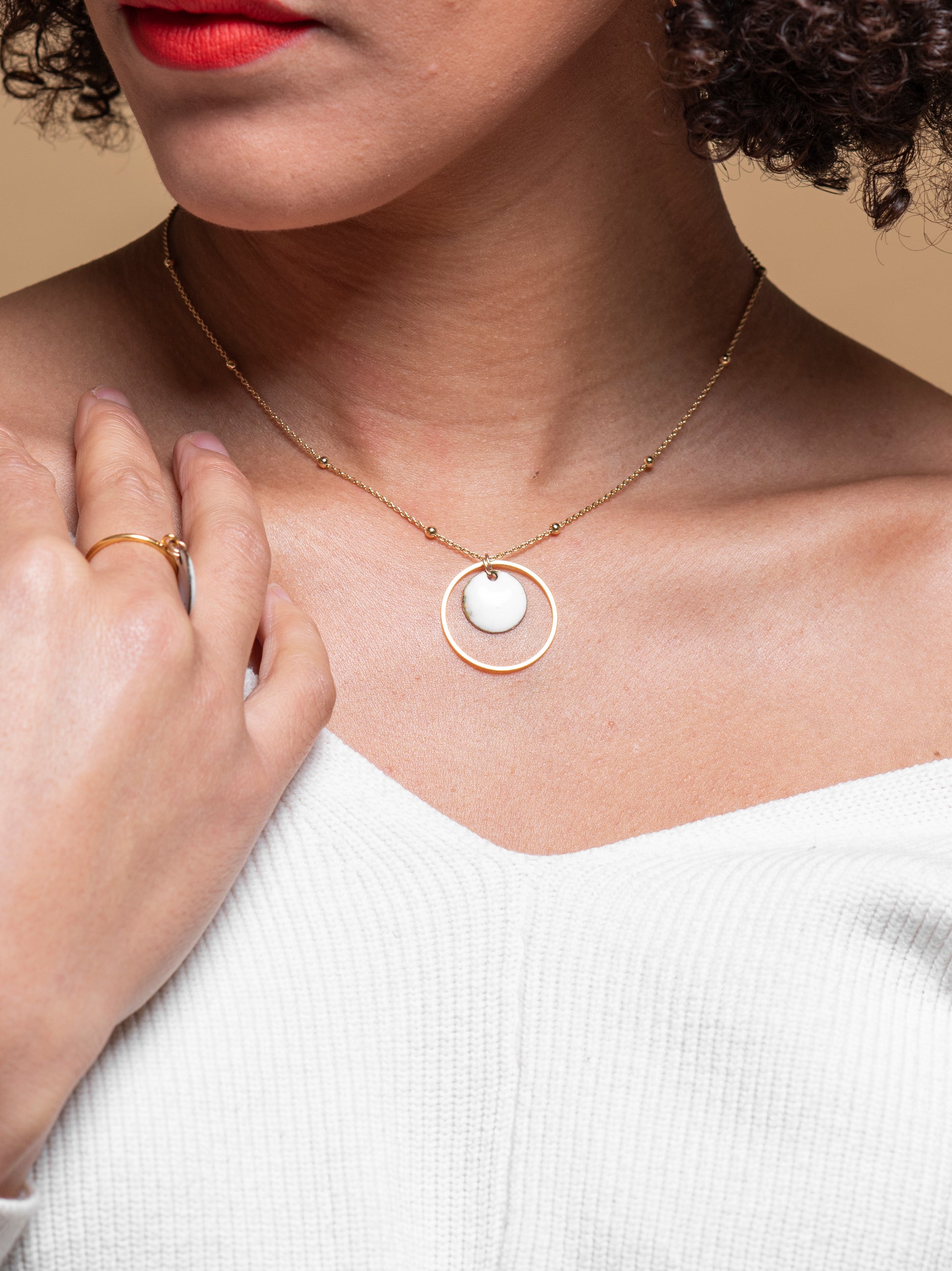Collier Anneau Doré & Petit Rond en Émail Blanc – Sobriété chic