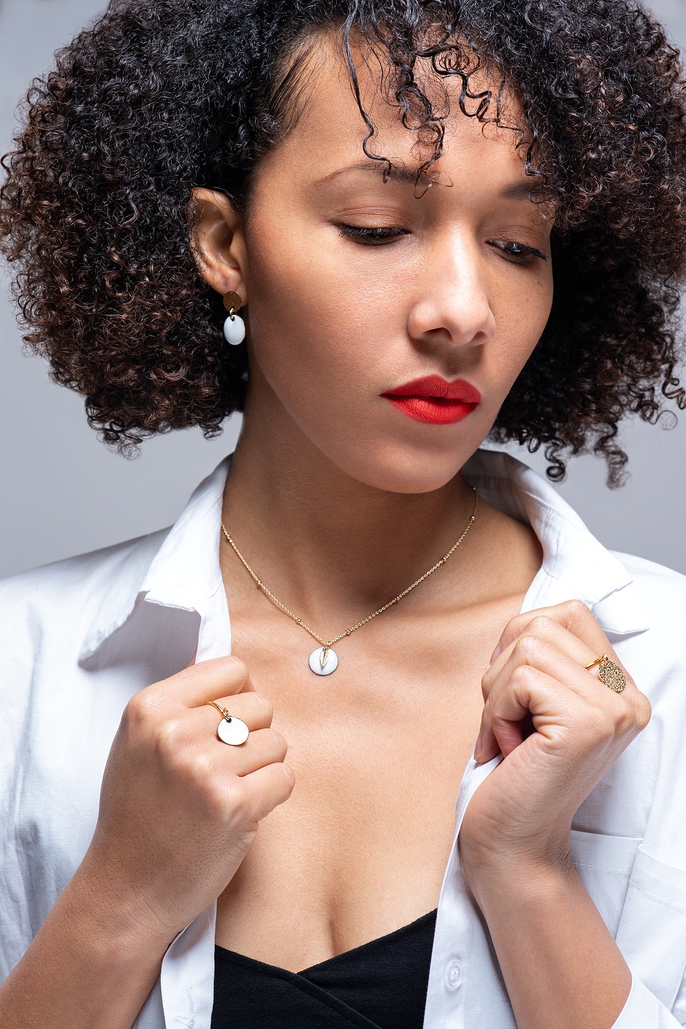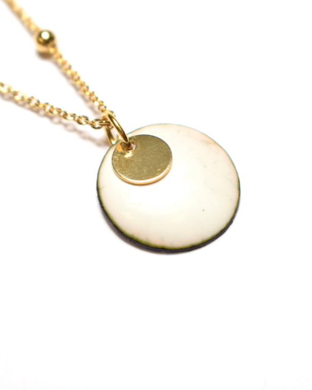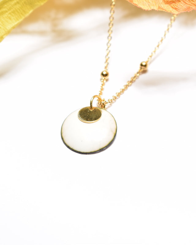 Collier petite médaille et sequin doré – Émail blanc et or